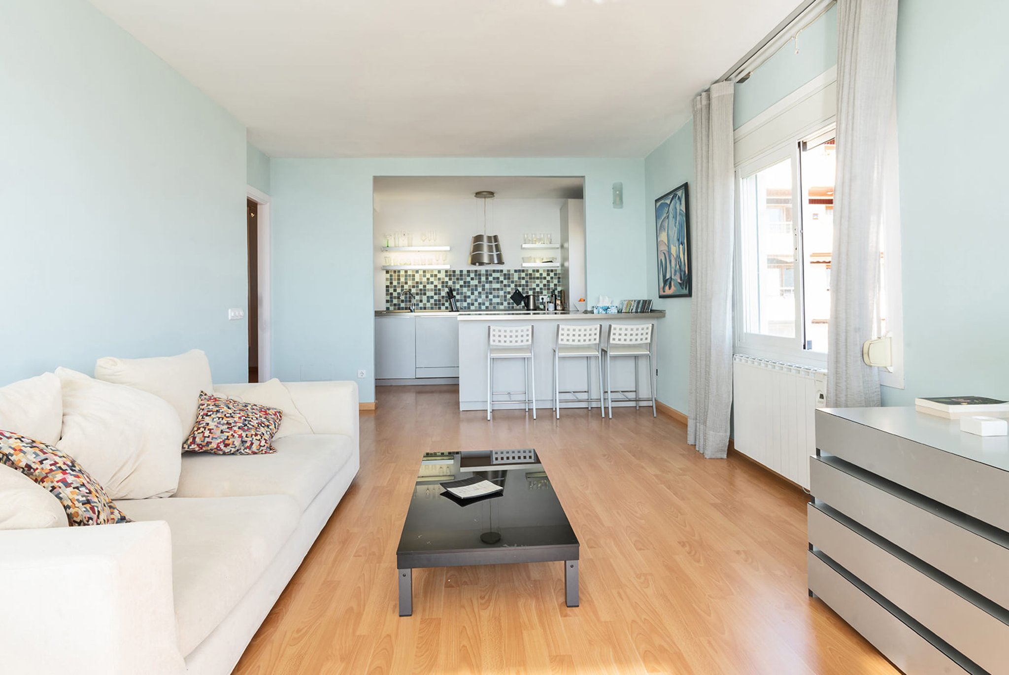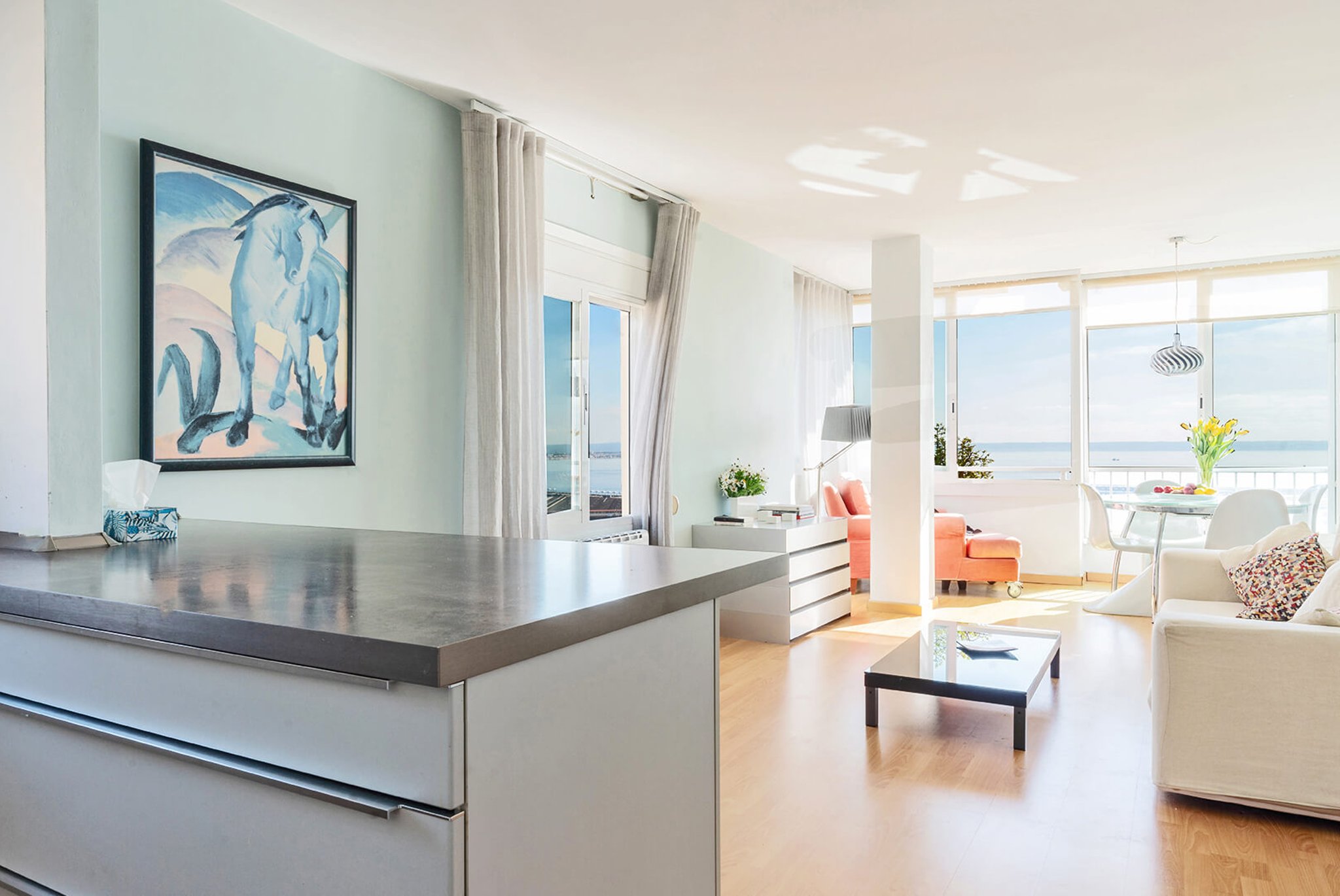 Modernt renoverad lägenhet belägen i det lugna området Bonanova. Bostaden ligger på femte våningen i ett hus med gemensam pool och trädgård. Lägenheten har en boyta på 75 m2 med 2 sovrum och 2 badrum. Köket och vardagsrummet har öppen planlösning och erbjuder en häpnadsväckande utsikt över Palmabukten, båthamnen, katedralen och havet. Lägenheten totalrenoverades år 2010 och är mycket ljus.