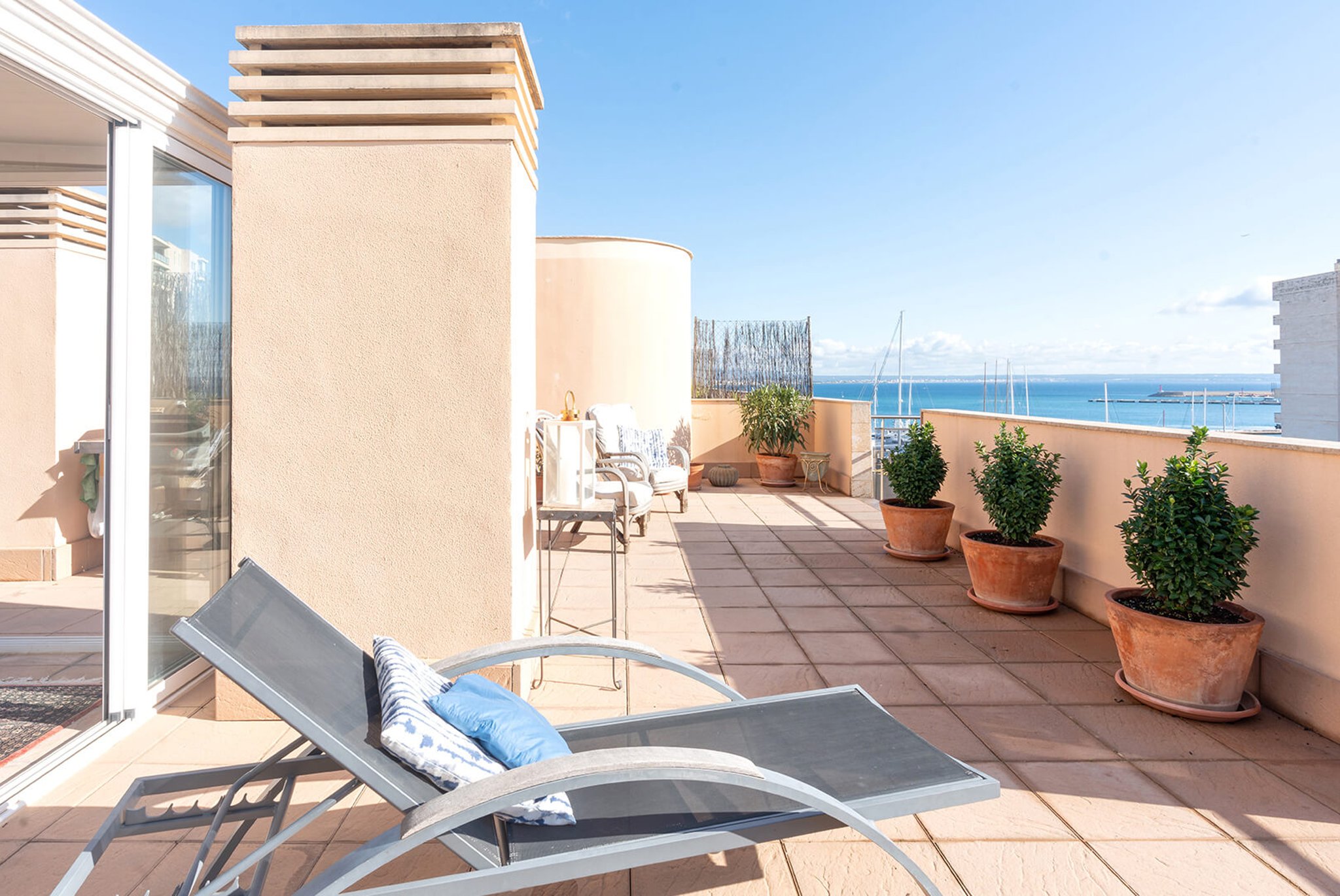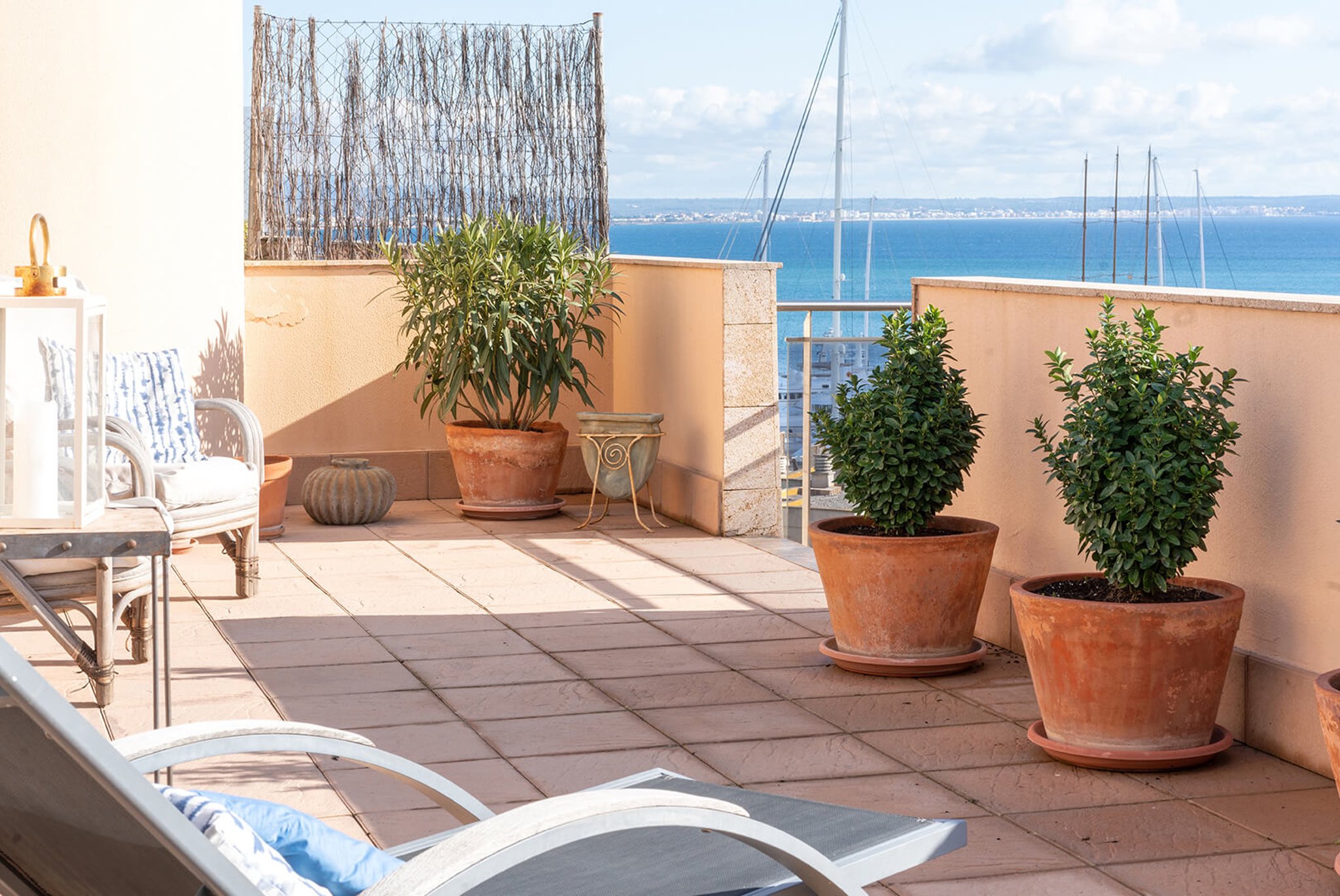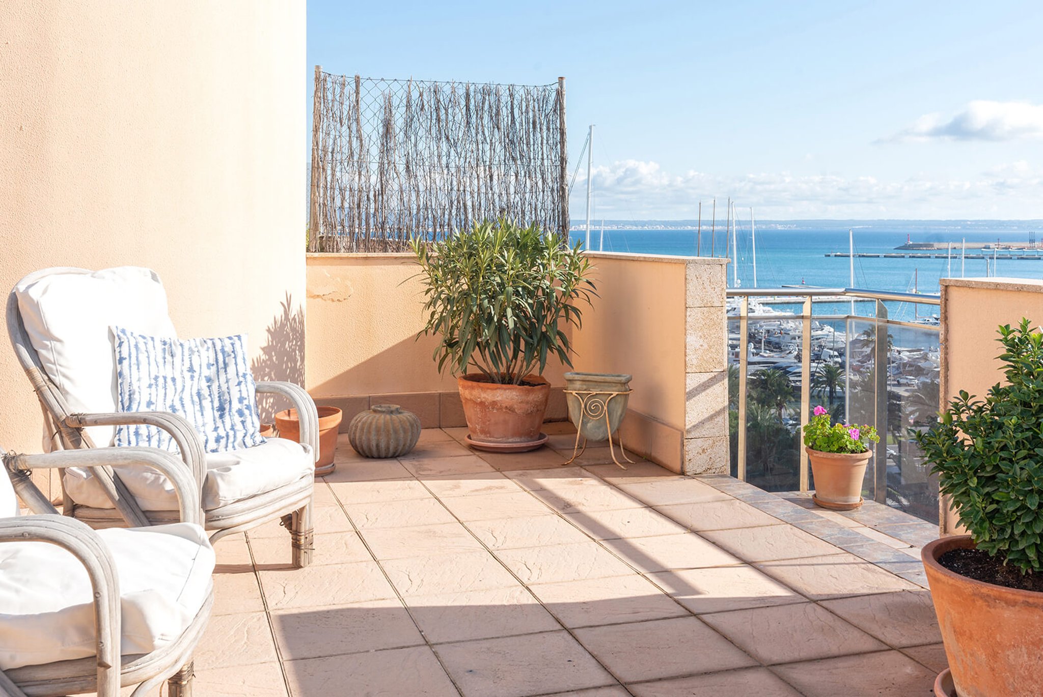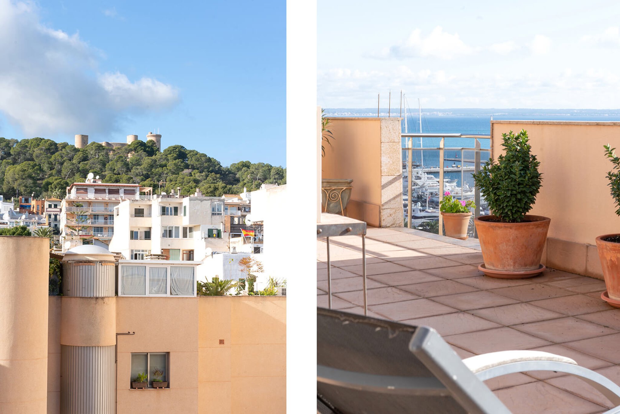Den totala boytan på 90 m2 består av totalt 3 sovrum, 2 badrum samt kök och vardagsrum. Master bedroom har utgång till en liten balkong i söderläge med havsutsikt. Från vardagsrummet finns även där utgång till en balkong med havsutsikt. En spiraltrappa leder dig upp till den rymliga takterrassen på 96 m2 med gott om utrymme för utomhusmöbler och solsängar. På terrassen finns en inglasad del med matplats. Härifrån kan man njuta av solen från morgon till kväll och underbar utsikt över Palmas vackra hamn.