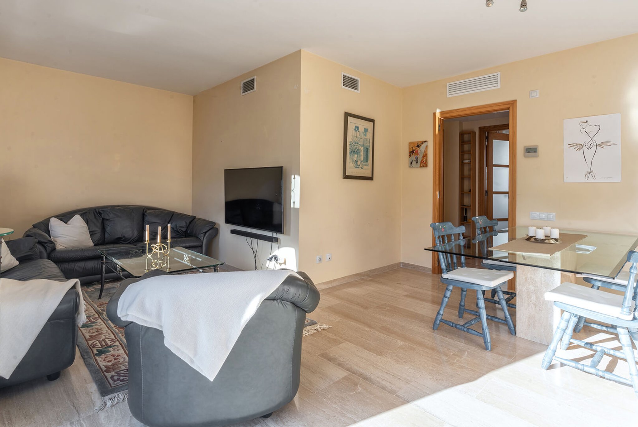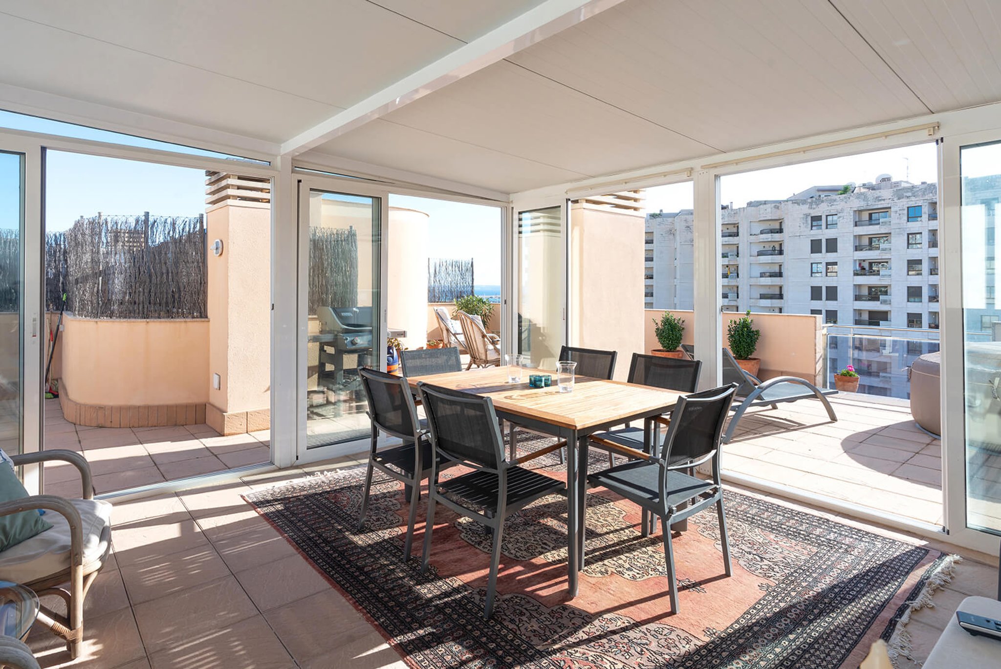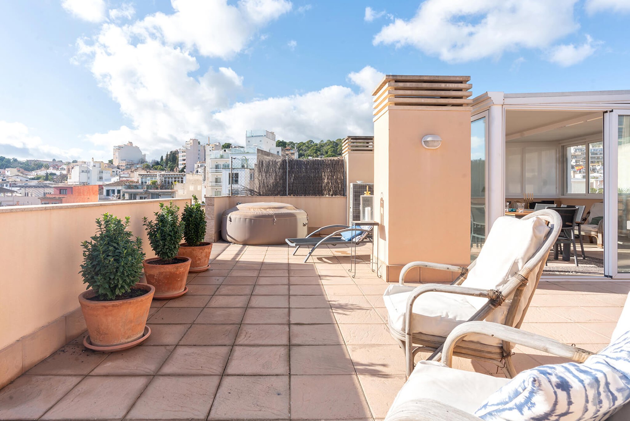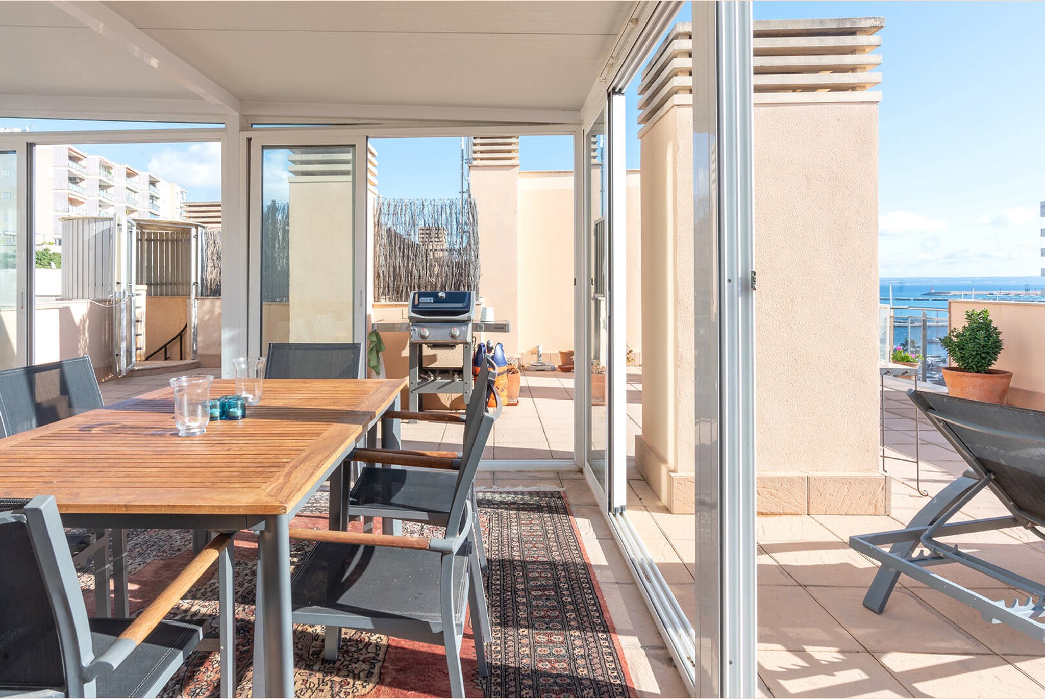 Den totala boytan på 90 m2 består av totalt 3 sovrum, 2 badrum samt kök och vardagsrum. Master bedroom har utgång till en liten balkong i söderläge med havsutsikt. Från vardagsrummet finns även där utgång till en balkong med havsutsikt. En spiraltrappa leder dig upp till den rymliga takterrassen på 96 m2 med gott om utrymme för utomhusmöbler och solsängar. På terrassen finns en inglasad del med matplats. Härifrån kan man njuta av solen från morgon till kväll och underbar utsikt över Palmas vackra hamn.