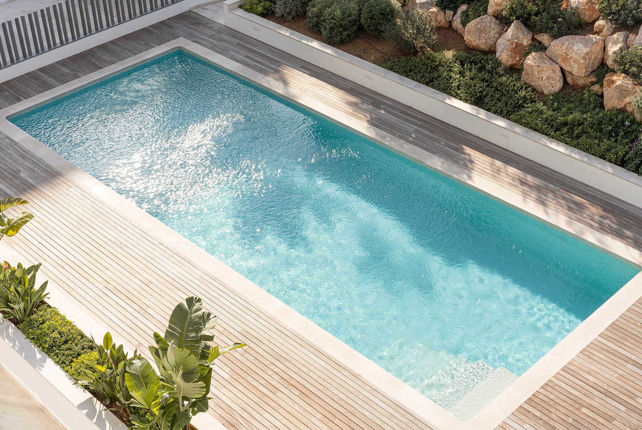 Lägenheterna på bottenvåningen har en helt egen privat terrass på 20 m2 och tillgång till den stora uppfriskande gemensamma poolen.