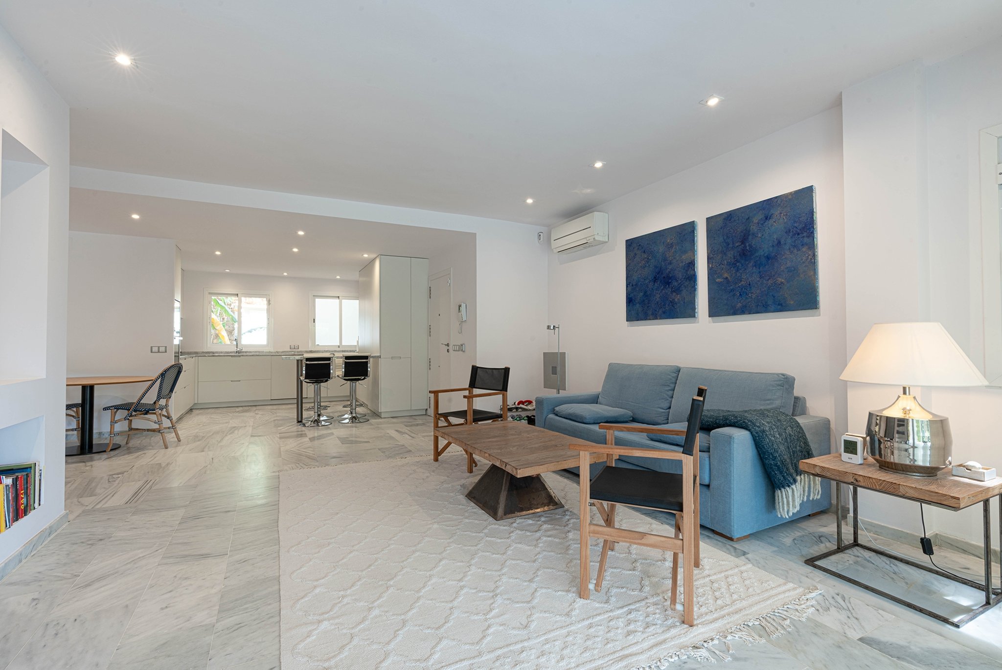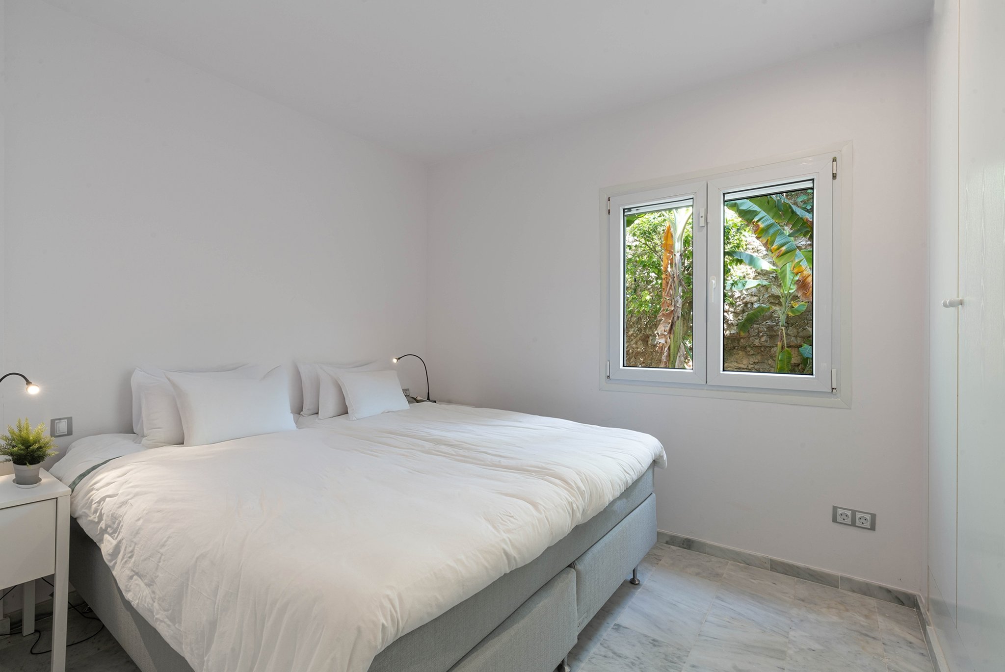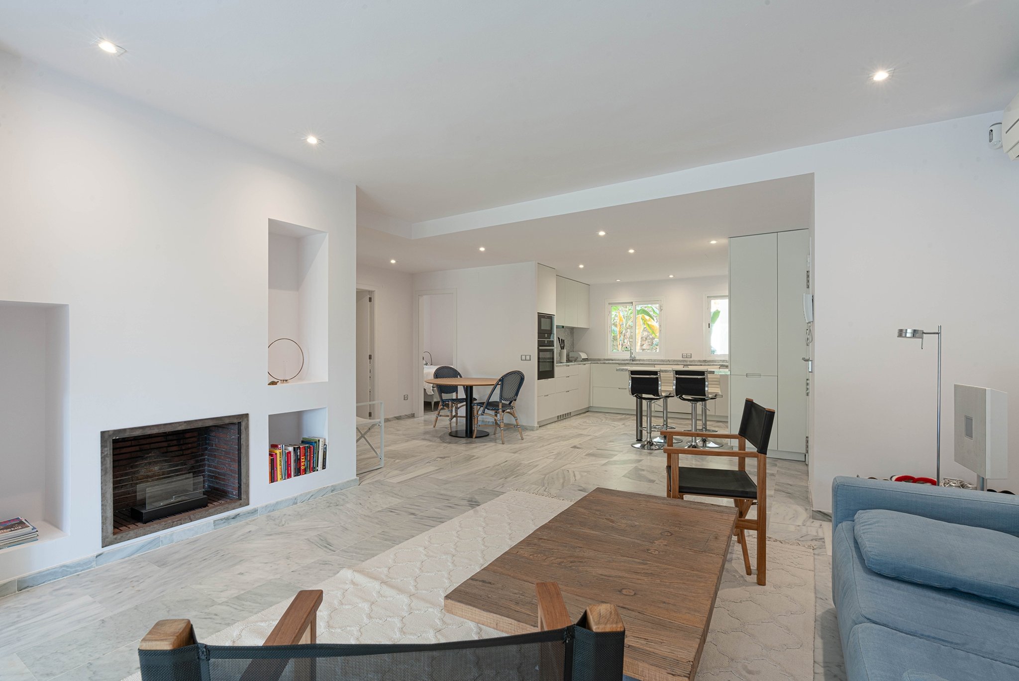 Lägenheten är nyligen renoverad och erbjuder en boyta om 95 kvm, fördelad på två rymliga sovrum, två stilrena badrum, ett öppet och fullt utrustat kök samt ett generöst vardagsrum med öppen spis. Franska dörrar leder ut till en 35 kvm stor terrass med utsikt över den privata trädgården som sträcker sig över hela 150 kvm. Bostaden har en genomgående modern och stilren design, med mycket ljusinsläpp och naturliga materialval.