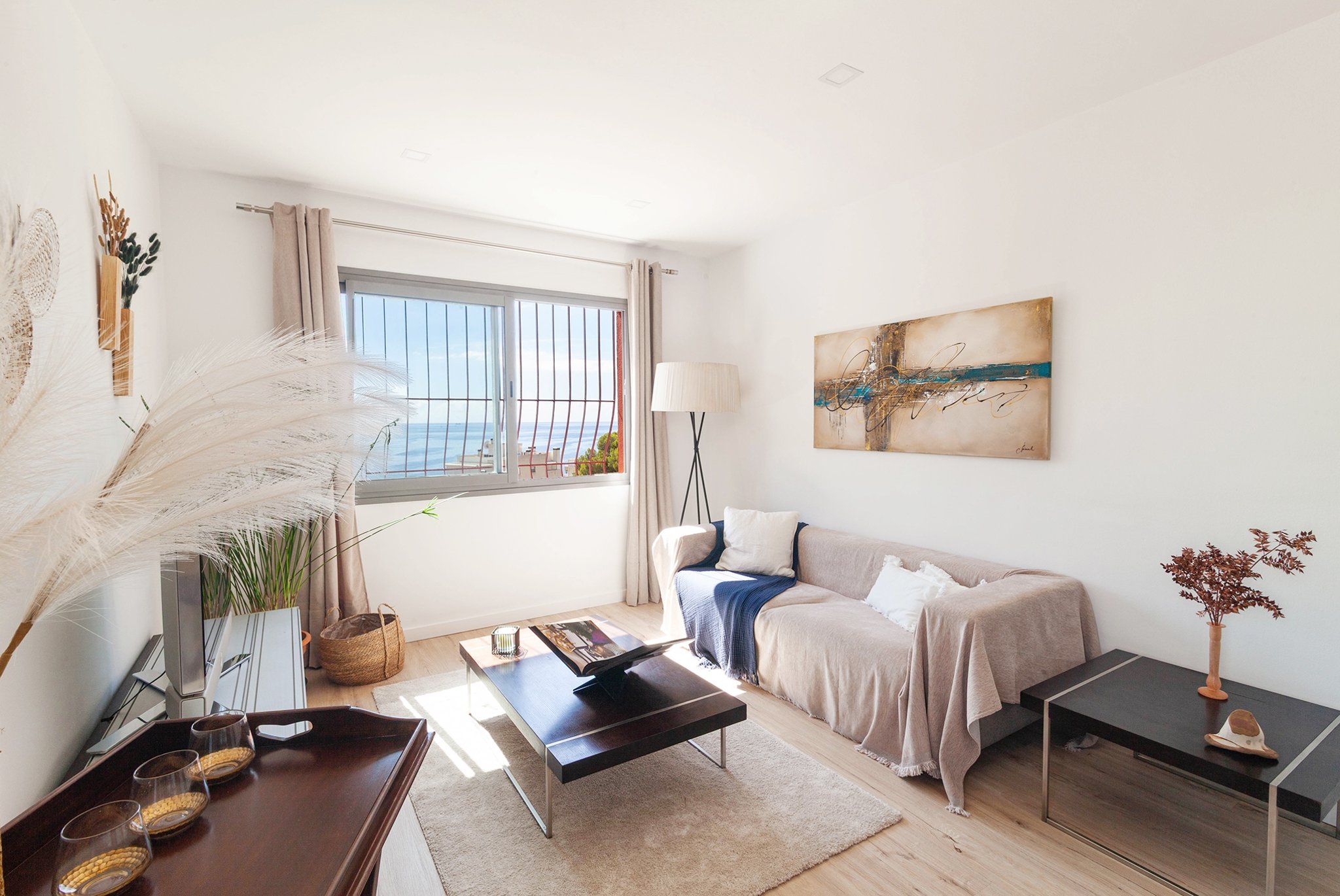 Lägenheten är totalrenoverad och belägen på markplan i en liten och exklusiv byggnad med endast åtta bostäder. Den erbjuder 60 m² välplanerad boyta med ett ljust och öppet vardagsrum/matsal, ett fullt utrustat kök, ett rymligt badrum samt ett generöst sovrum med egen klädkammare. Från både vardagsrum och sovrum njuter du av en fantastisk panoramautsikt över havet.