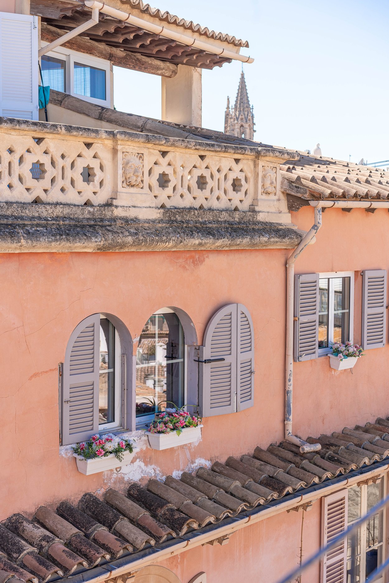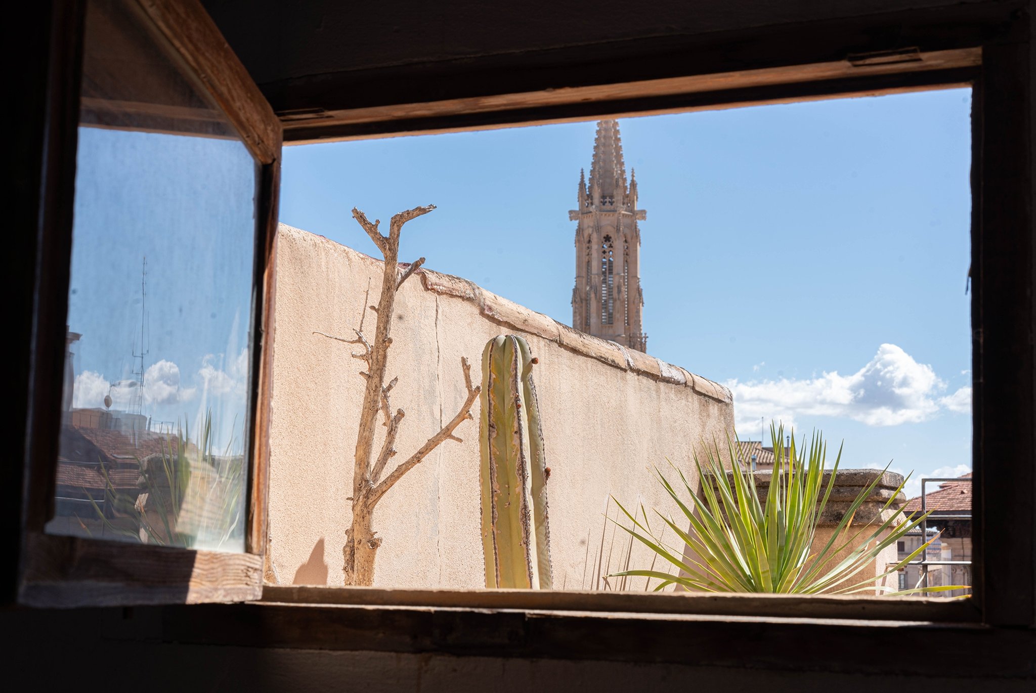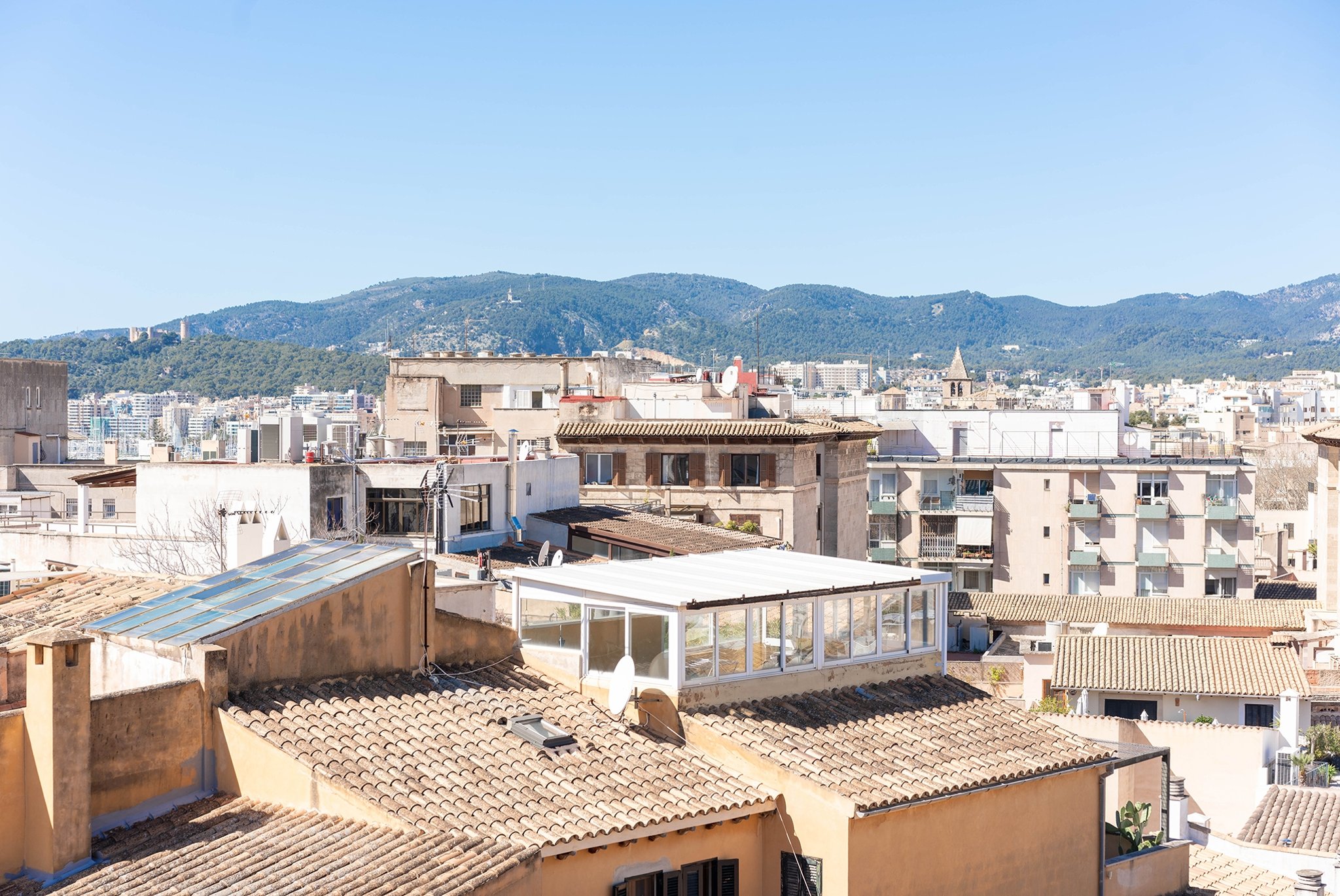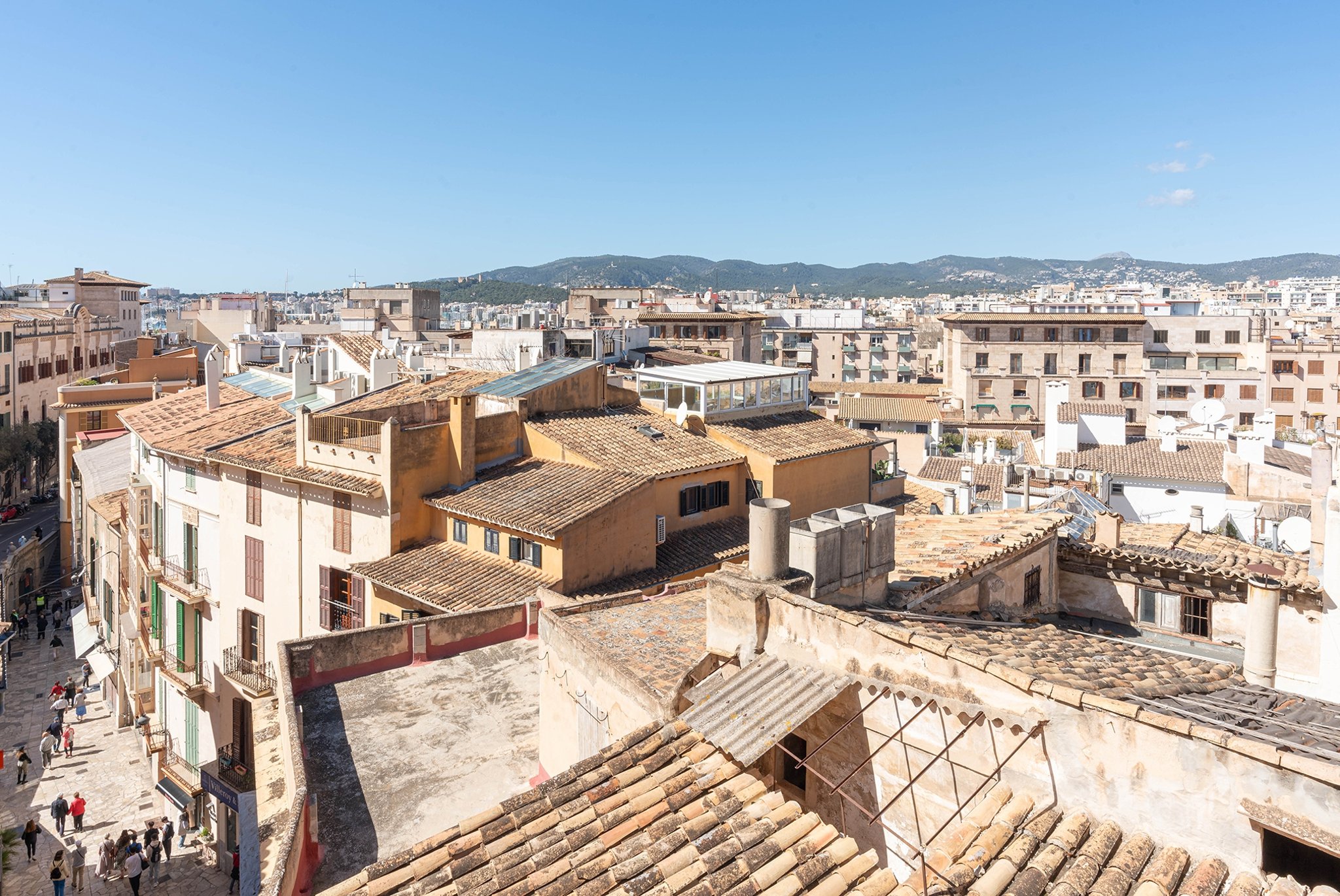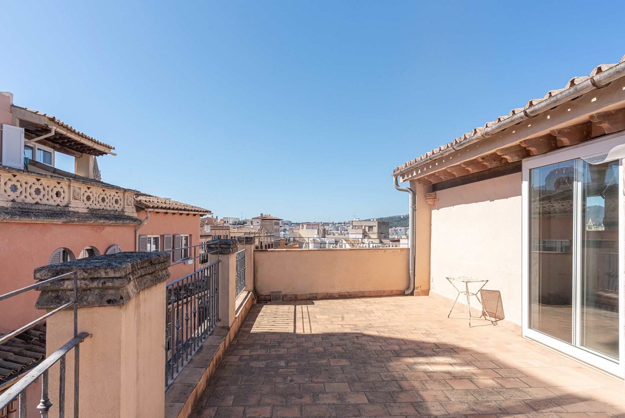 Den stora terrassen på över trettio kvadratmetrar är bostadens höjdpunkt och har utsikt över historiska byggnader, katedralen, bergen och lyxbåtarnas mastar i hamnen.