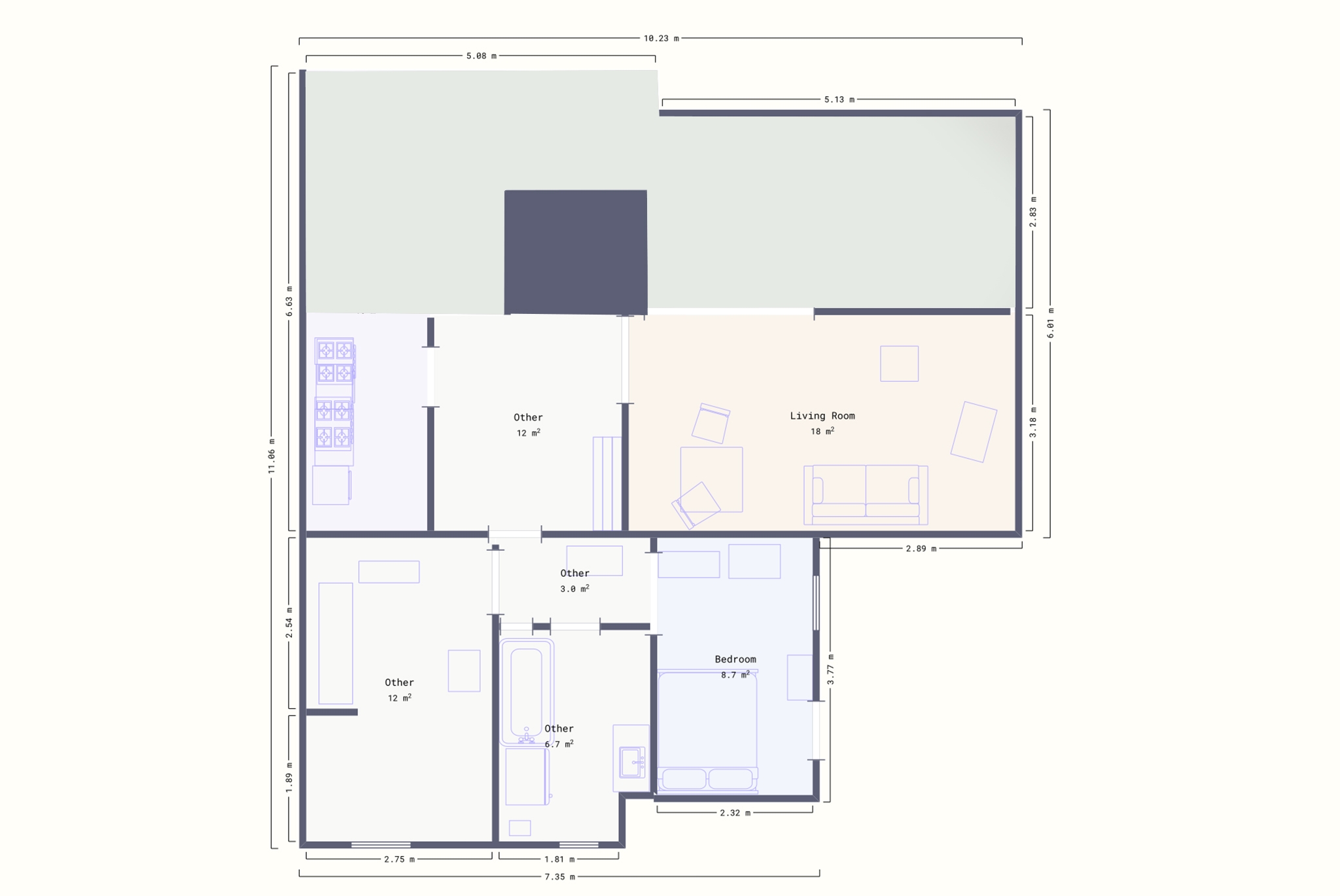 Takvåningen sträcker sig över hela det översta planet på en byggnad med fem våningar utan hiss. Planlösningen är alldeles utmärkt och både vardagsrummet, matrummet och köket vetter ut mot den stora terrassen som har sol hela dagen.