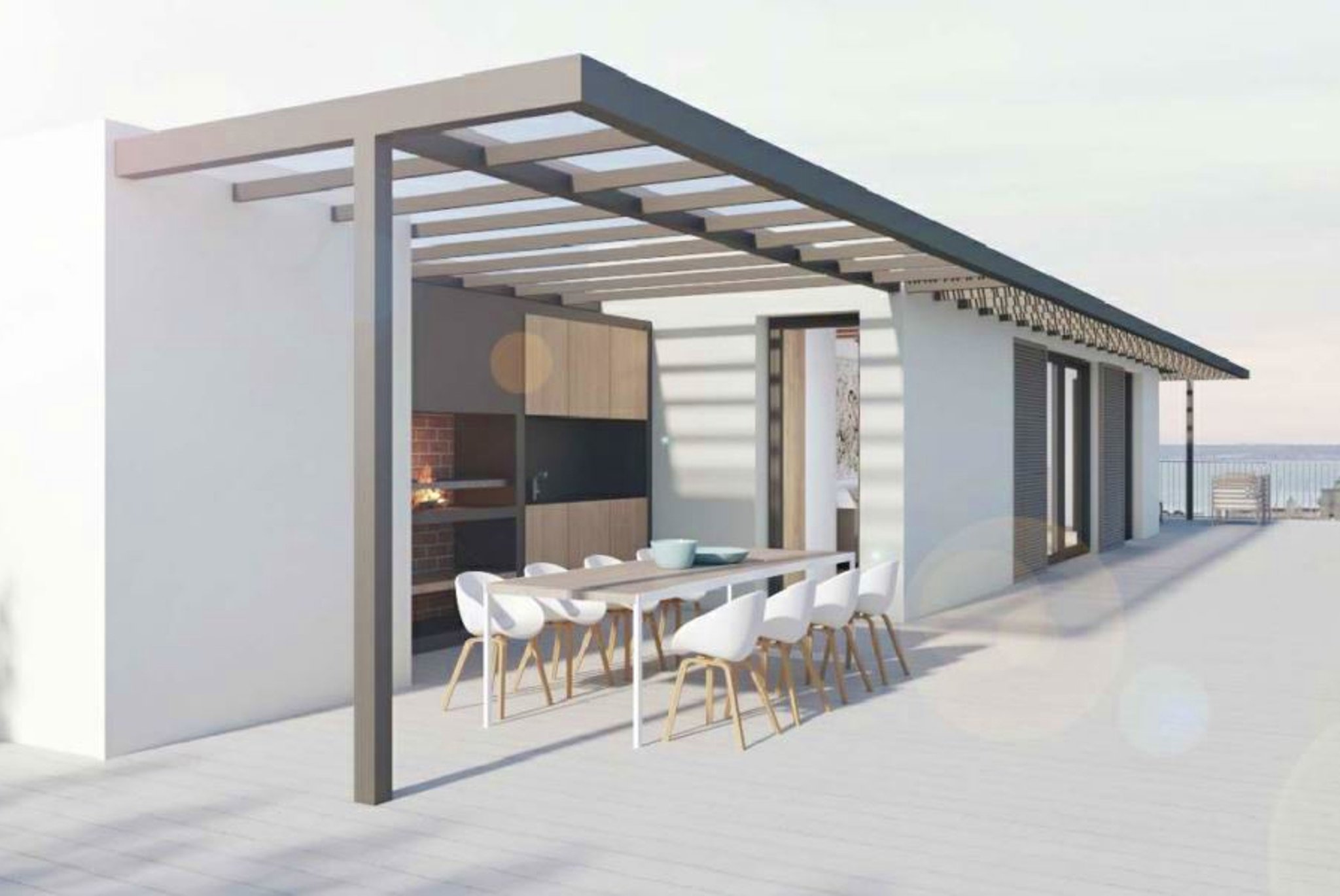 Den generösa boytan på 166 m2 är fördelad på 3 sovrum (ursprungligen 4), 2 kompletta badrum och en gästtoalett, ett separat kök med möjlighet att öppna upp till vardagsrummet. På nästa våning ligger den stora terrassen på 140 m2 med en studio på 26 m2. Vi har renderingarna med exempel på hur renoveringen av studion skulle kunna genomföras. Terrassen erbjuder fantastisk utsikt, sol hela dagen och BBQ. Bostaden är belägen i en byggnad från år 2000 med få grannar, hiss och underjordiskt garage. En parkeringsplats och förråd ingår i priset.