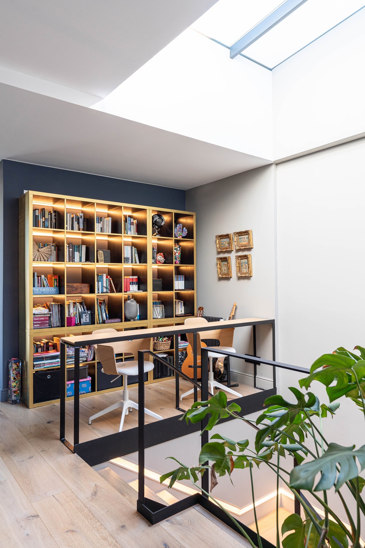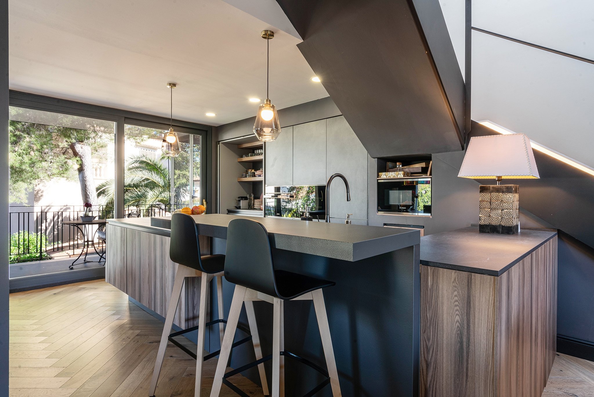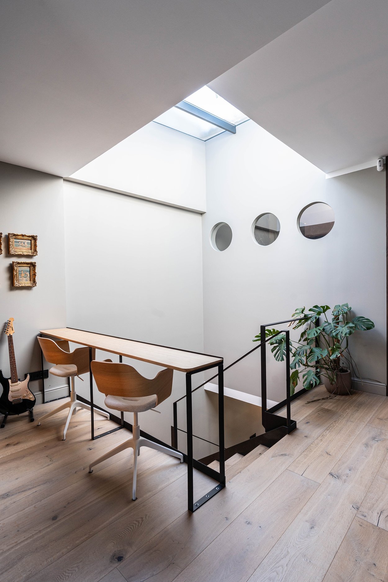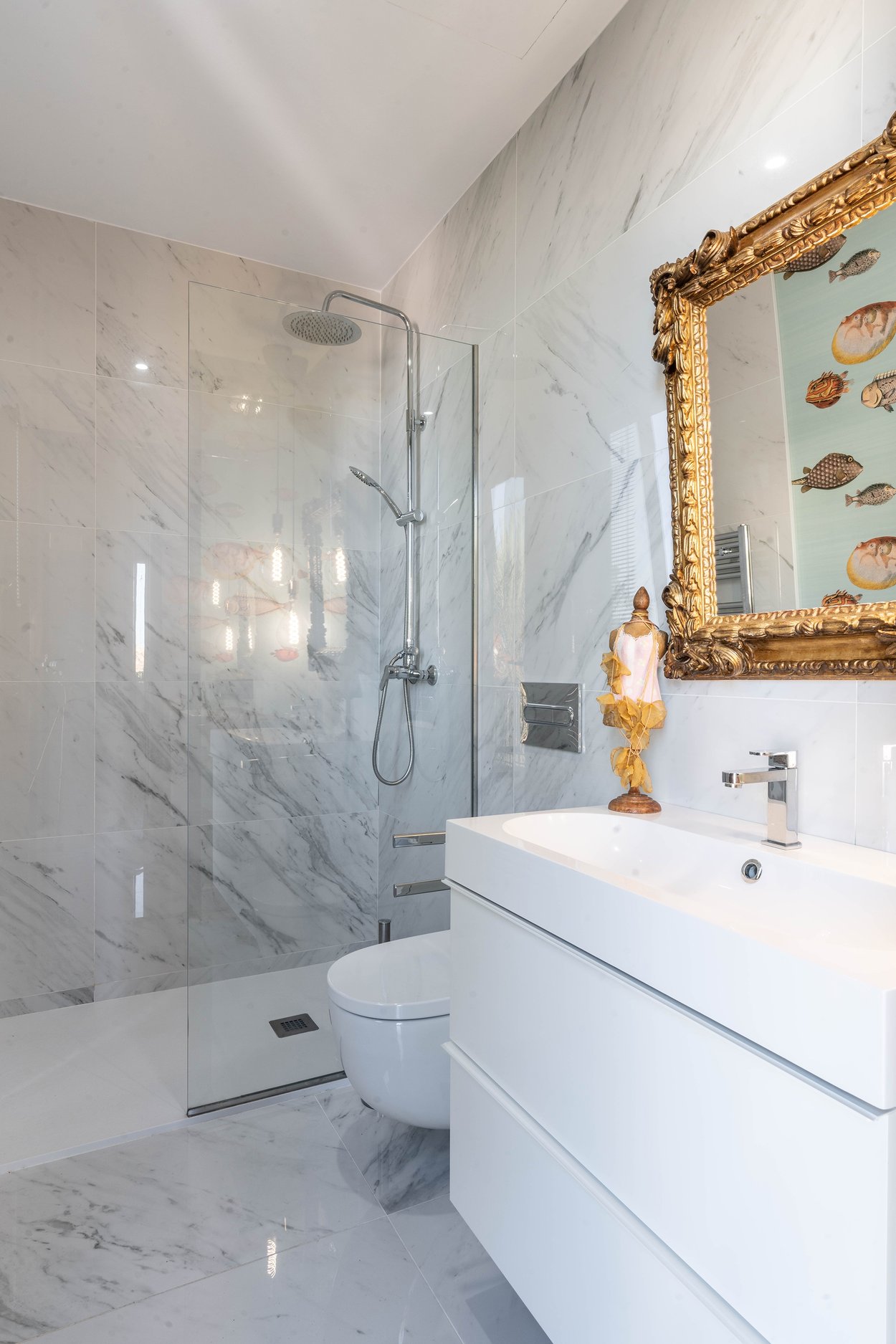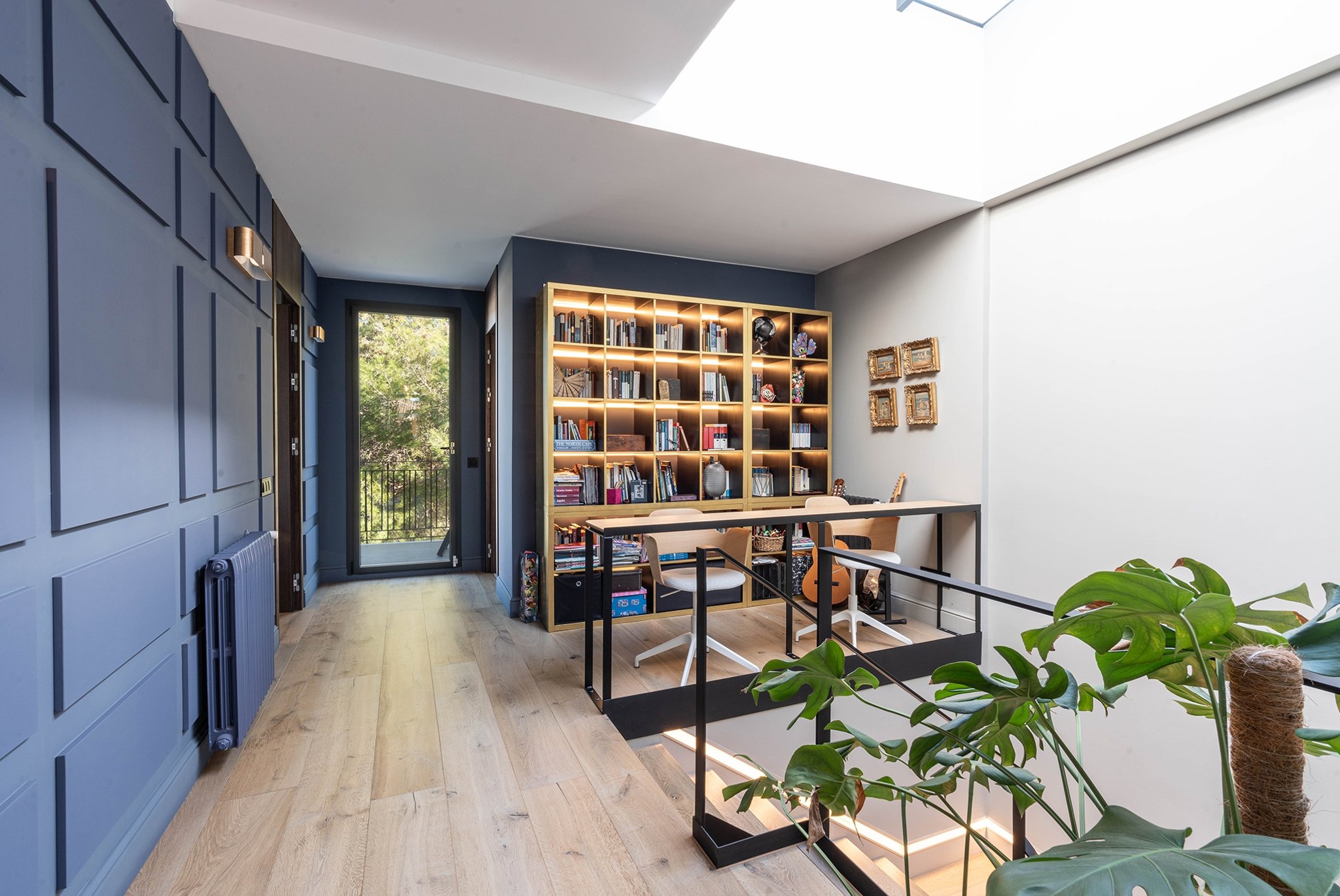 På andra våningen finns en öppen studio med härligt ljusinsläpp från ett stort takfönster. Här ligger också två sovrum, med möjlighet att skapa ett tredje. Det största sovrummet har både en-suite badrum och walk-in-closet, samt så erbjuder denna våning också en rymlig terrass med fantastisk utsikt. Ett andra badrum finns för det andra sovrummet.