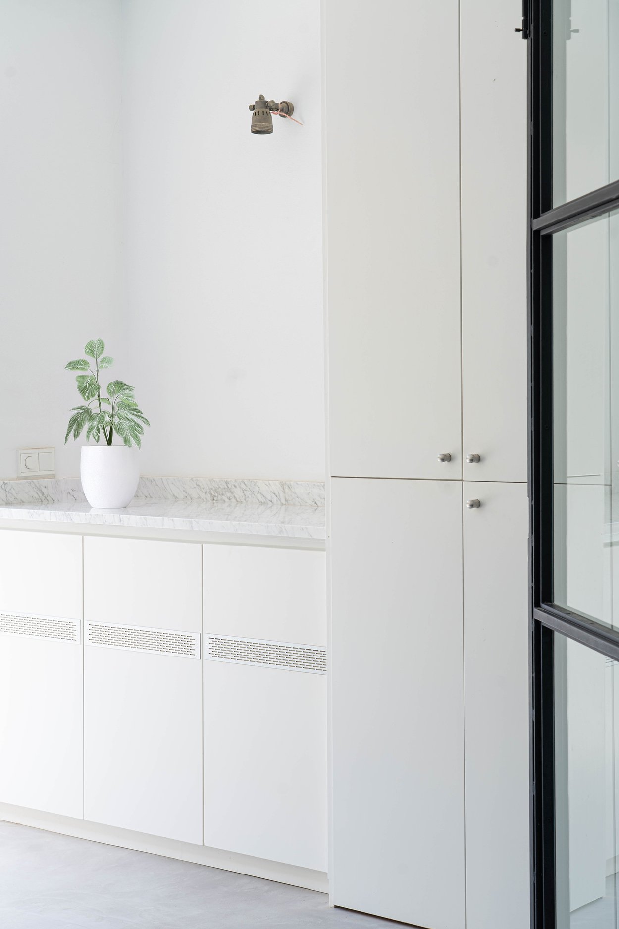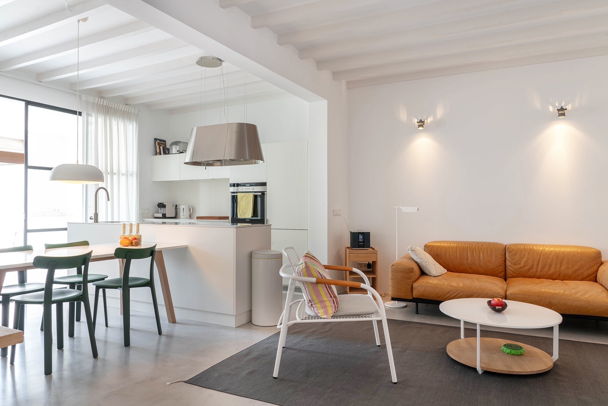 Bostaden genomsyras av ljusa färgtoner, ett generöst ljusinsläpp och smakfulla detaljer som eleganta fönster och dörrar i svart smide – en stilren kontrast som ger karaktär och personlighet.