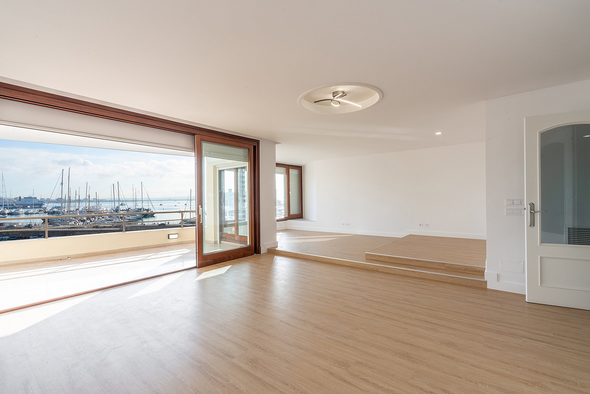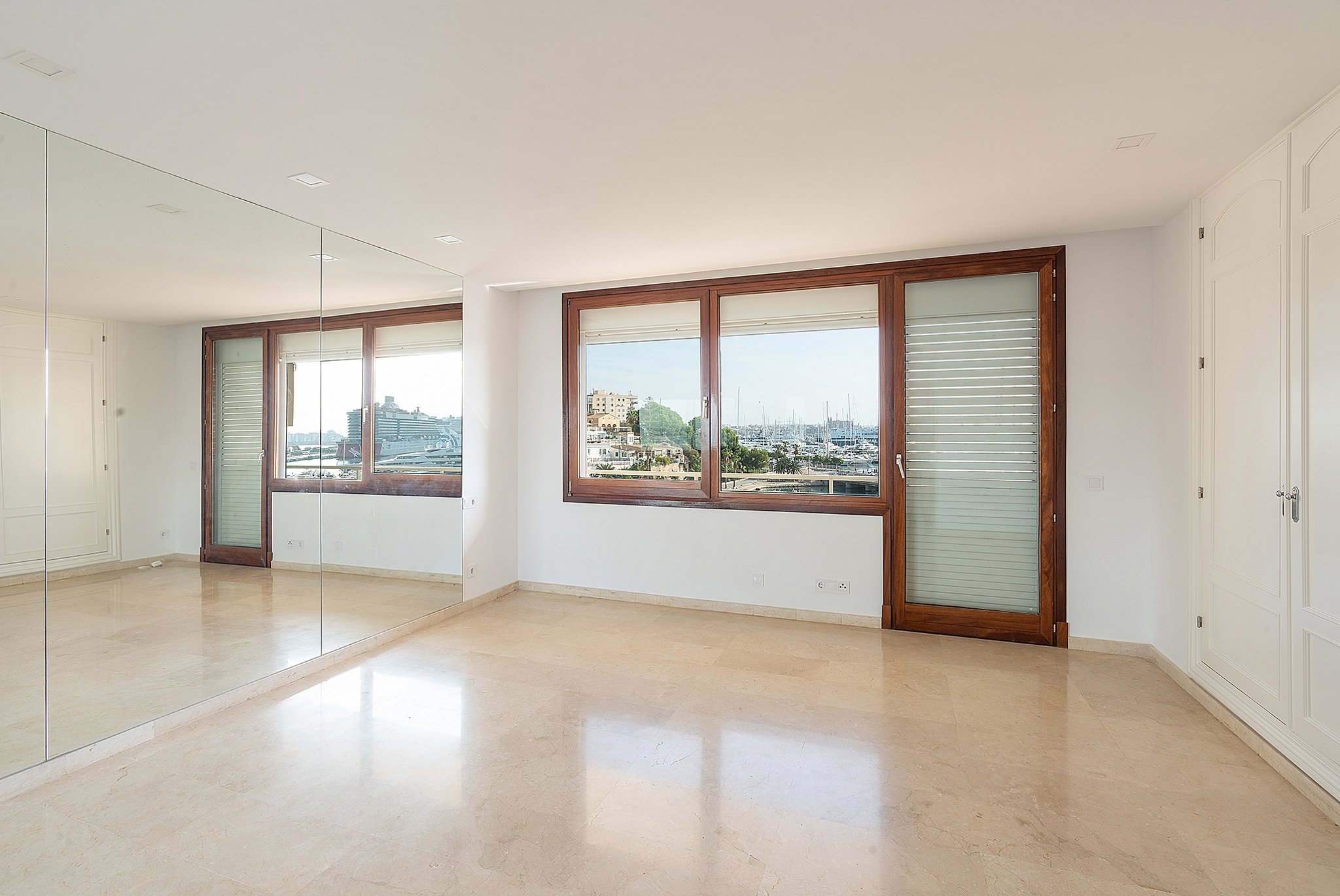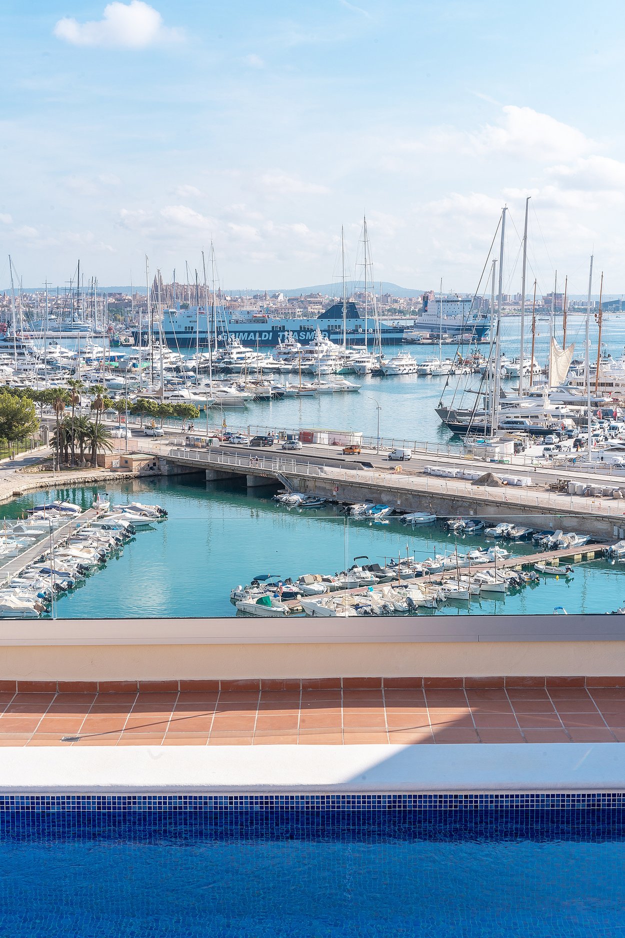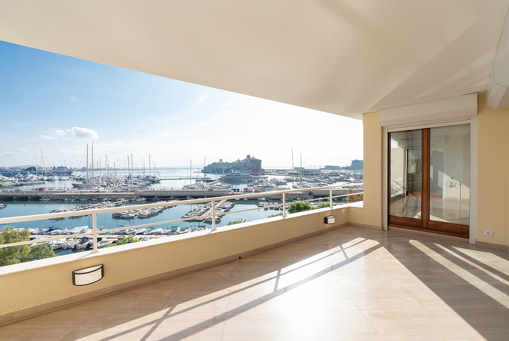 Denna moderna och högkvalitativa takvåning ligger i ett utmärkt läge med imponerande utsikt över hamnen och bukten i Palma. Det prestigefyllda vardagsrummet/matsalen har utsikt över hamnen och de stora fönstren garanterar gott om ljus. Det rymliga och högkvalitativa köket är en självklarhet i en fastighet som denna. Tre stora sovrum, alla med en-suite badrum, och ett litet sovrum garanterar utrymme för familj och vänner. Två balkonger på samma nivå som lägenheten och en gemensam takterrass med pool kompletterar detta erbjudande.