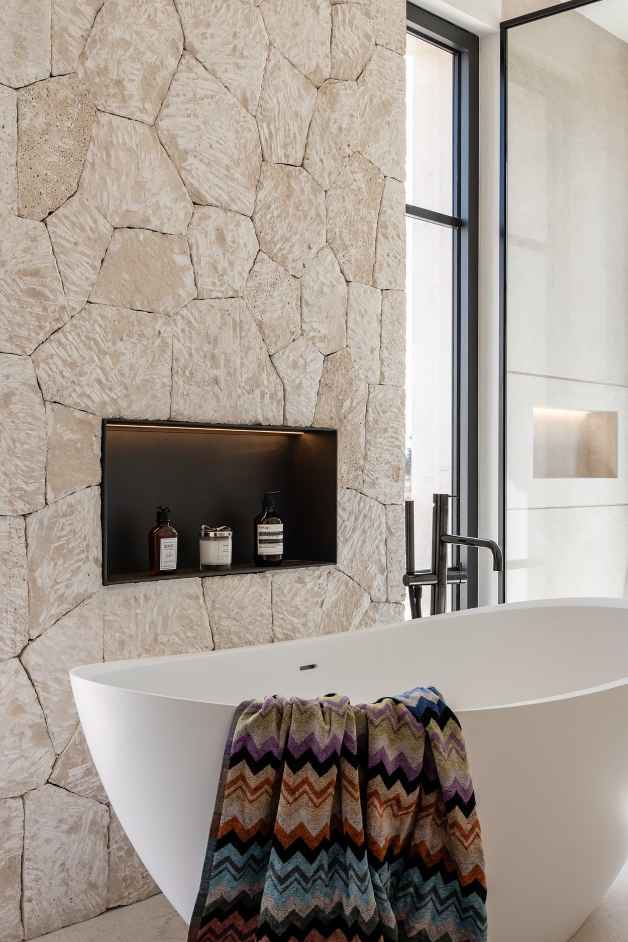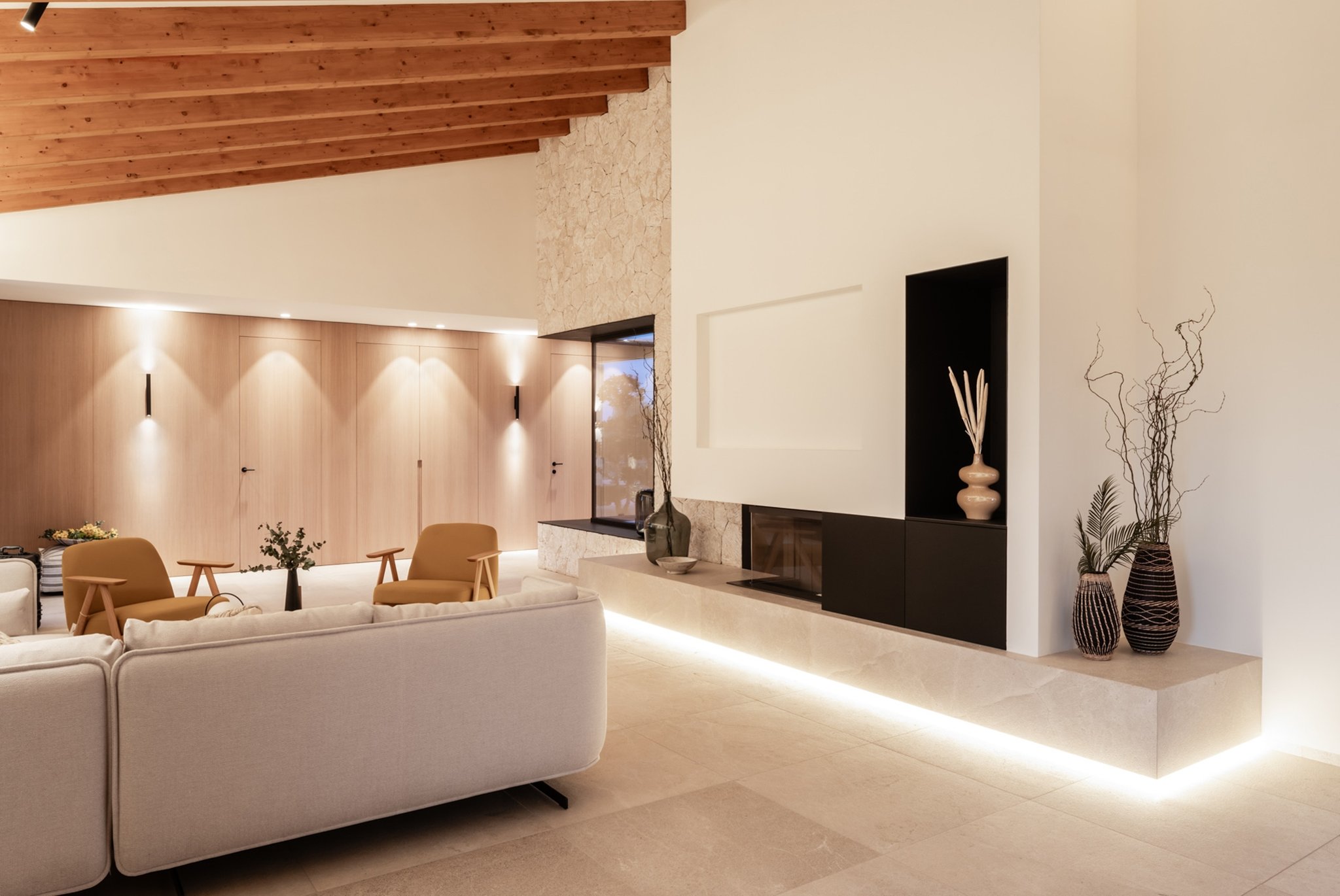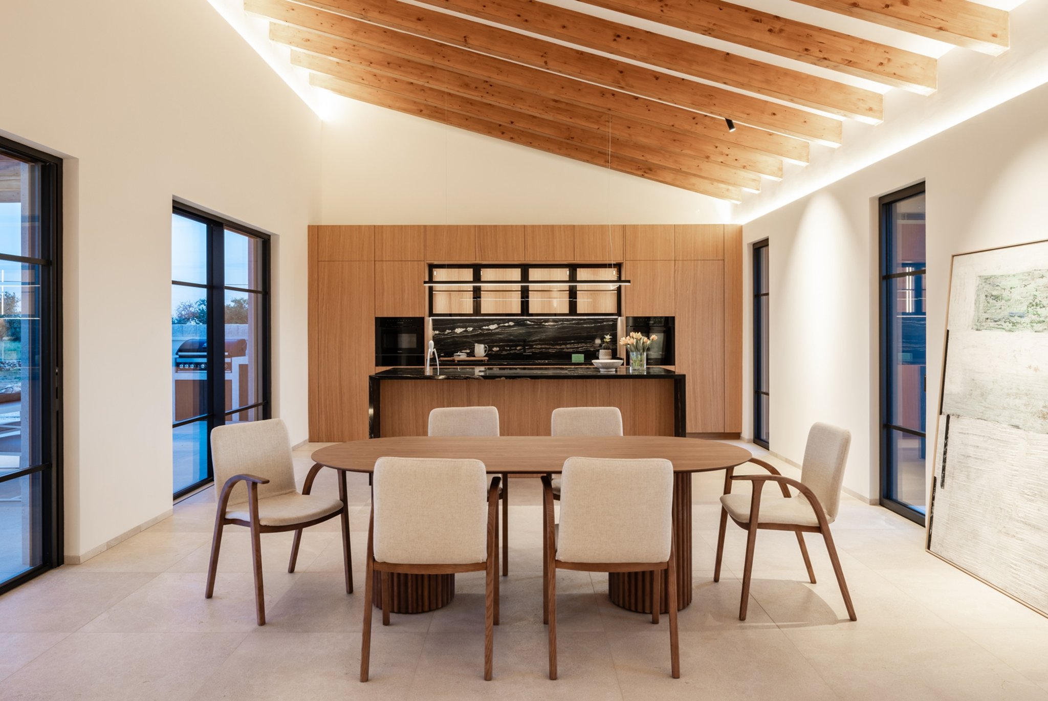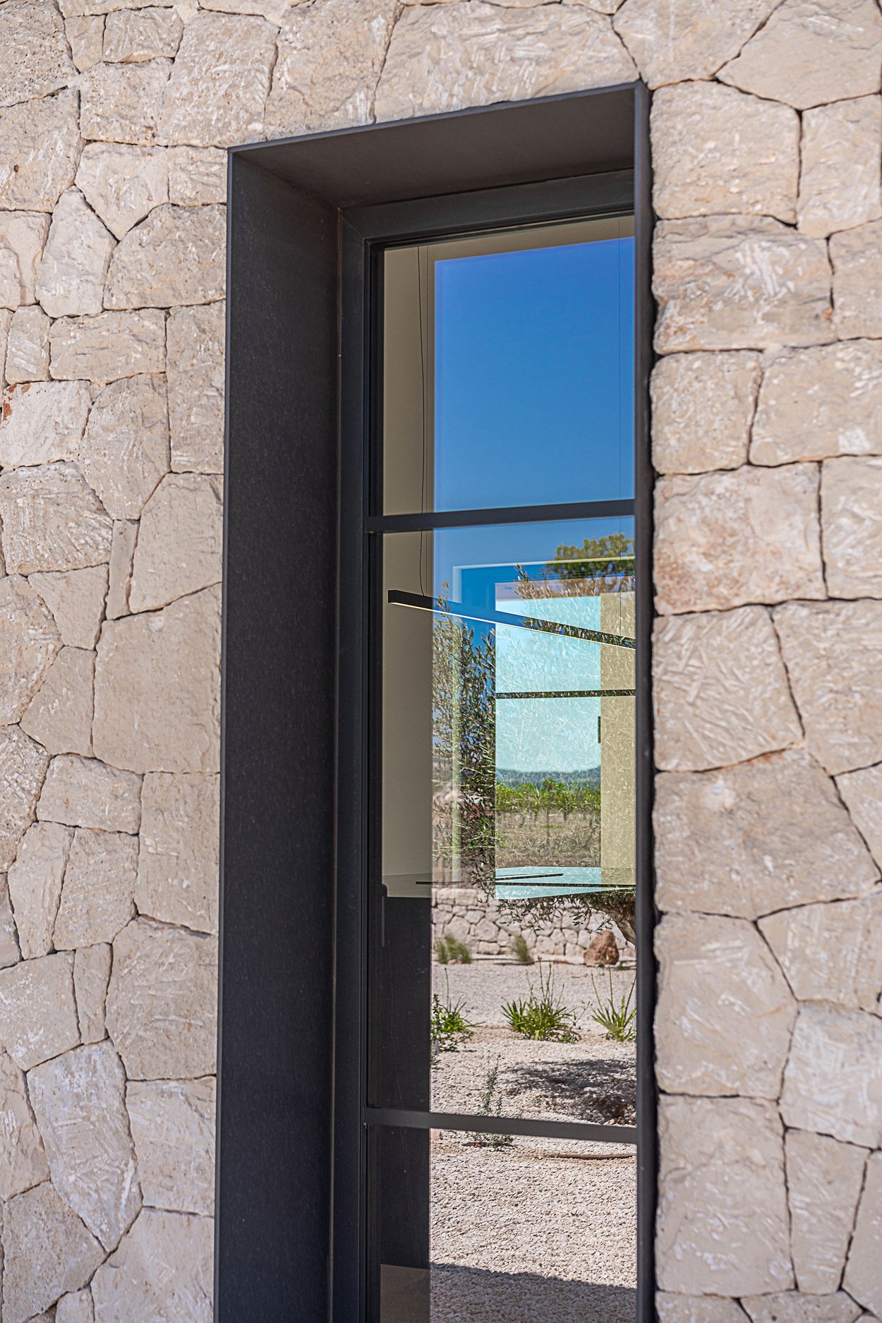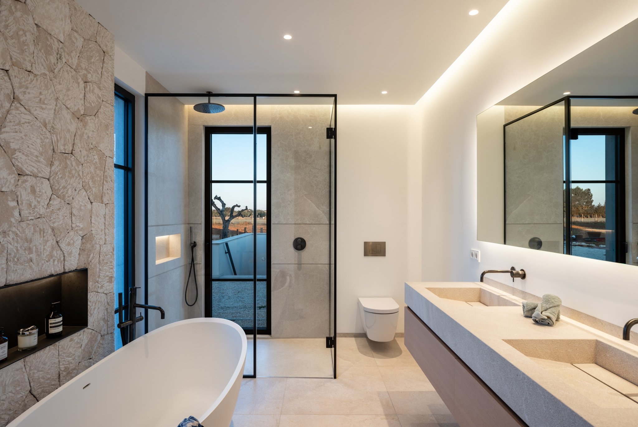 Ytterligare information: Luftkonditionering, golvvärme, öppen spis, pool, garage med plats för 2-3 bilar, högkvalitativa material på alla ytor, och rustika grå stengolv både inomhus och utomhus. Duschkar och väggbeklädnad är av samma material, badrumsarmaturer av märket Iconico, sanitetsutrustning från Duravit, badrumskakel av samma grå natursten med integrerade handfat av samma material. Fasaderna består av murverk med stenar och kalkbruk, medan ytterdörrarna är tillverkade av antracitgrå aluminium med Climalit-glas och sol- och ljudskydd.