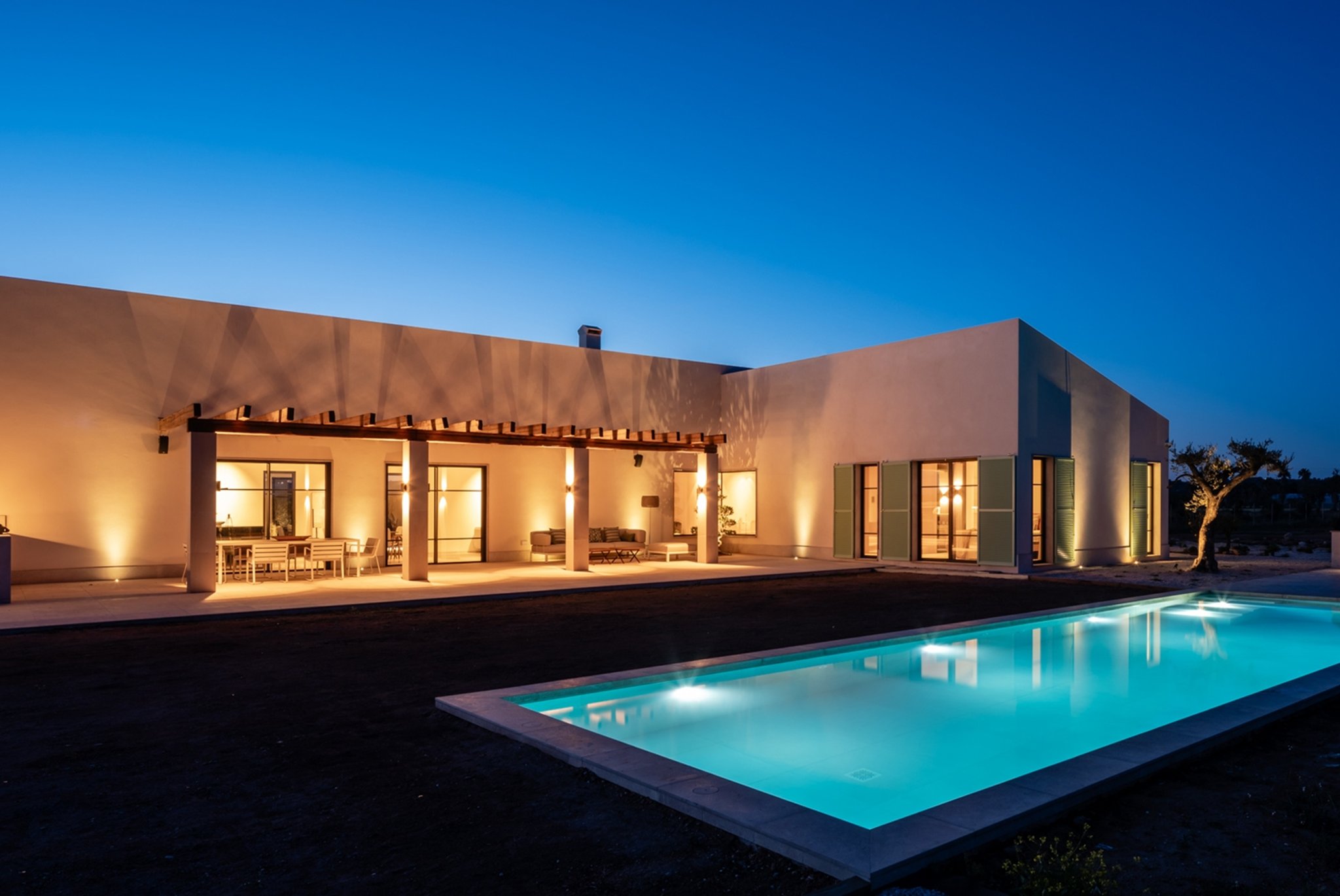 Denna vackra, moderna och lyxiga fastighet ligger på landsbygden intill den lilla staden Campos. I Campos finner du allt du behöver, och med bil är du där på fem minuter. Grannstaden Llucmajor som också har många fina restauranger och butiker och du når på tio minuter. Några av de vackraste stränderna på Mallorca, såsom den underbara Es Trenc och Colonia Sant Jordi, ligger också i närheten. Du når flygplatsen och Palma på 25 minuter med bil.